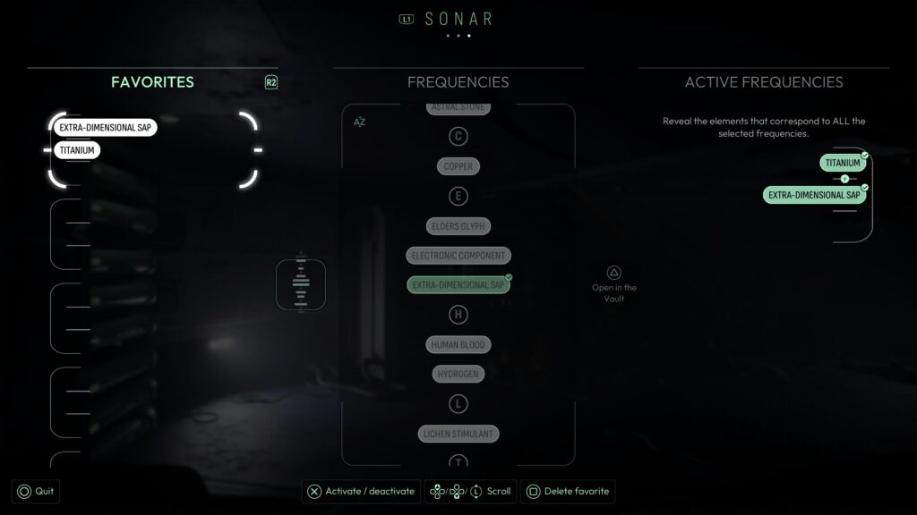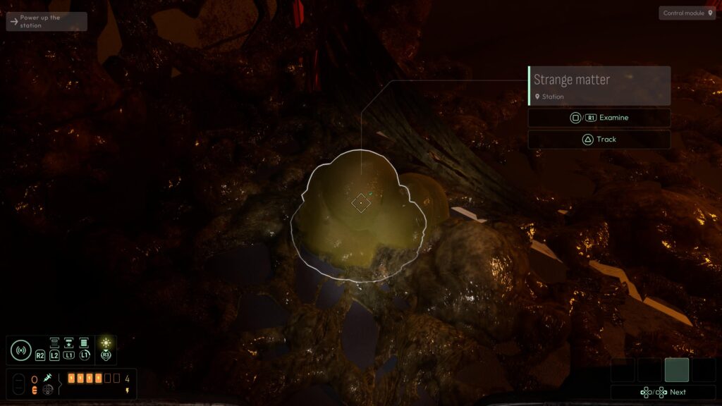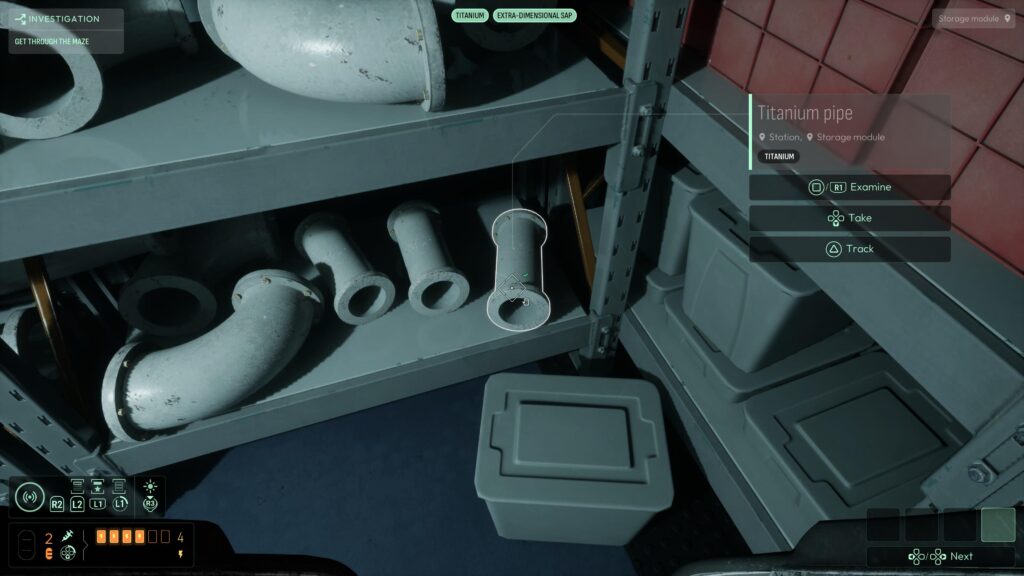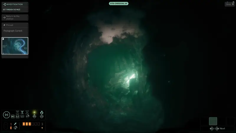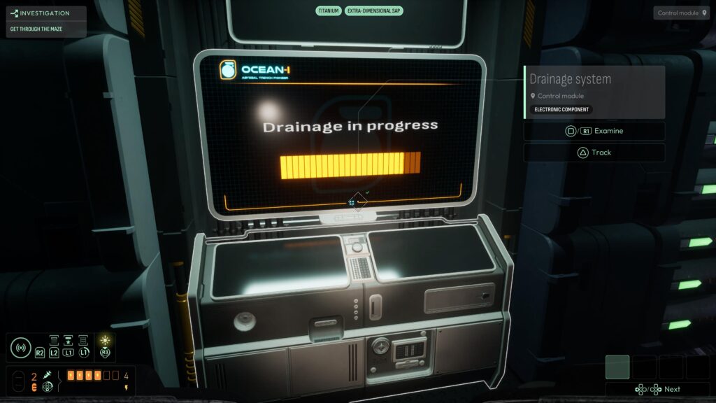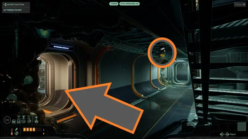 Head below where you rebooted the PIT station, and you’ll see a monitor stating ‘Drainage Error’ with pipes next to it. Analyse one of the green masses dotted around the station to get the Extra-Dimensional Sap frequency.