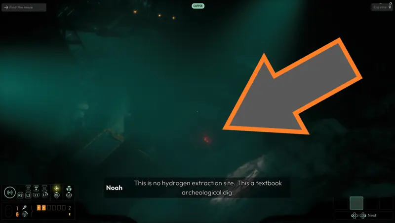 After restoring power to the PIT station and using the anchor’s Copper frequency to find the entrance to the underwater labyrinth, you’ll be in a chamber with a round pedestal in the middle with a recess on top. Explore the caverns, and use either the Copper or Scratch Mark frequency to find a hidden tunnel behind some plumes of smoke. (You can also use the ropes tying the anchors together as a visual aid.)