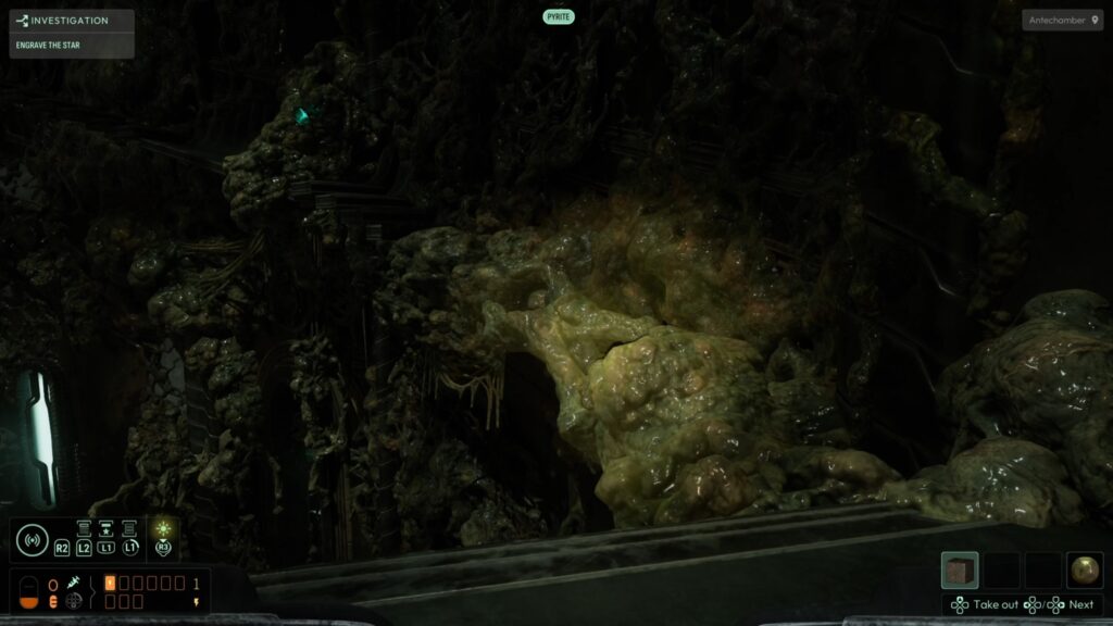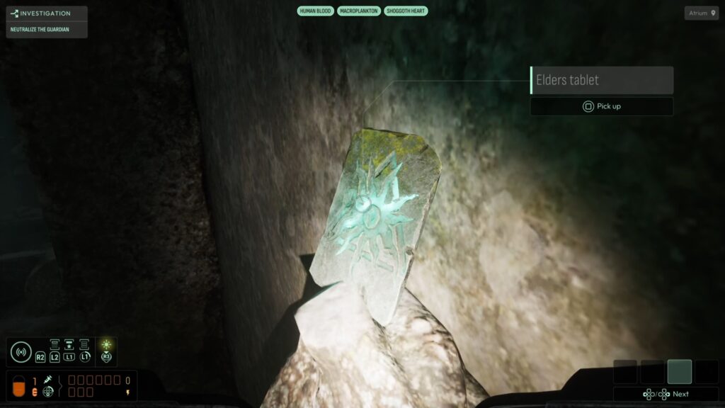 Evolution #10: The first perk in the area is located to the left of where you entered the citadel. Using the Human Blood, Shoggoth heart, and Macroplankton sonar frequency, you’ll notice the conveniently placed monster limb that leads up to a shiny blue trinket above. Quickly climb up this limb, and the perk will be waiting for you at the top. Just don’t get eaten by a grabber. If you can’t find it, equip the Elder Glyph sonar frequency, and it should pop up in your HUD.