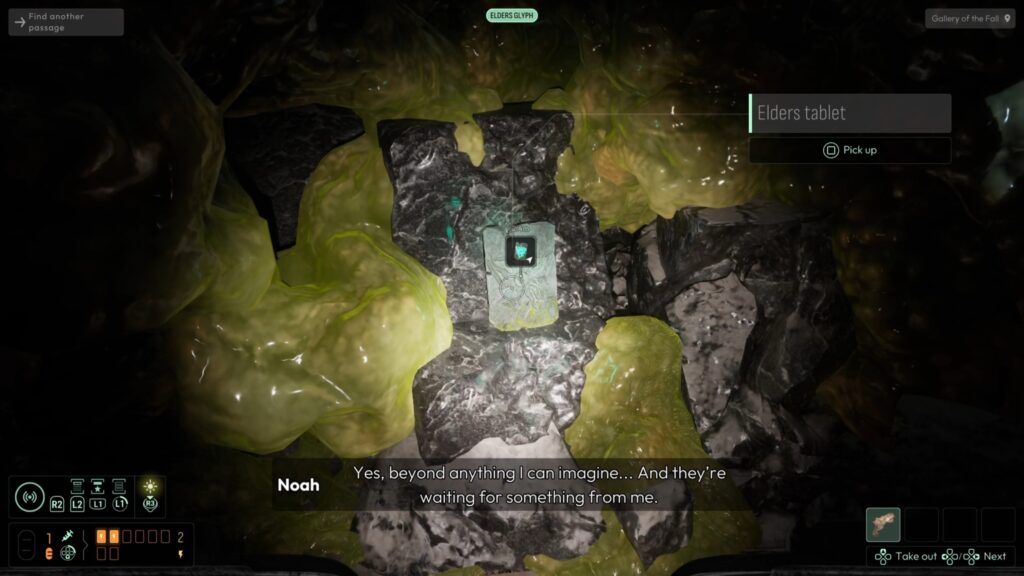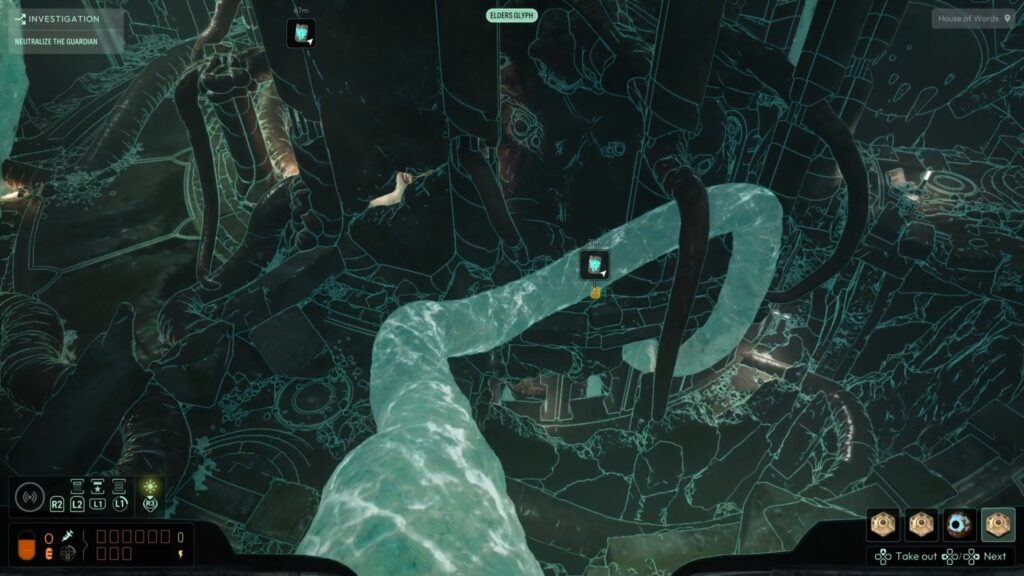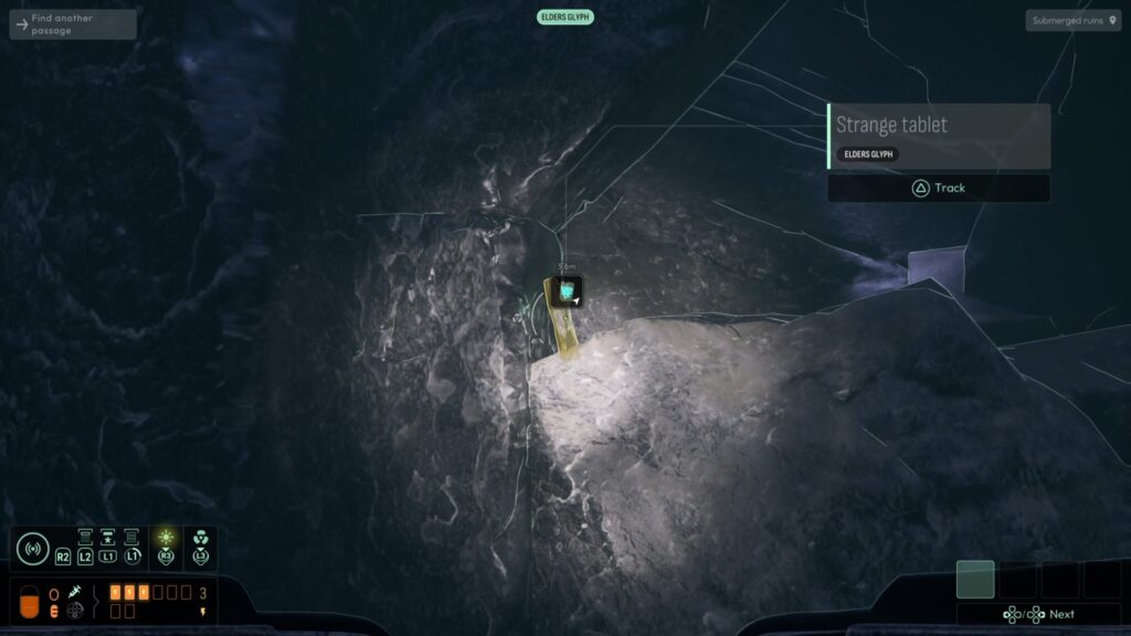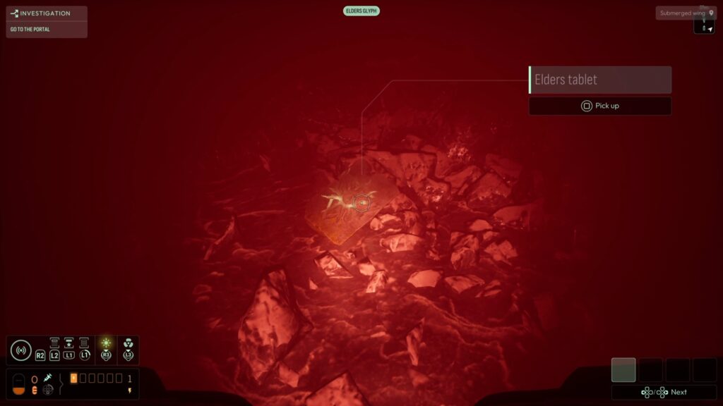 Evolution #5: This one is a little tricky. From our favorite man, David, head to the left into the room that looks like it’s flooded by blood and other nasty fluids. You are going to want to head to the submerged right doorway; the left is collapsed, so there’s really only one choice, and make your way down into the nastiness. The key here is to keep spamming your sonar, or you won’t be able to see. I recommend you equip the Elder Glyph sonar frequency so you have some kind of heading, but you do you. You see that this glyph is hidden behind a wall of stone that is impenetrable, but don’t fret. Simply look for the A-shaped stone column like above, and swim through it until you find it.