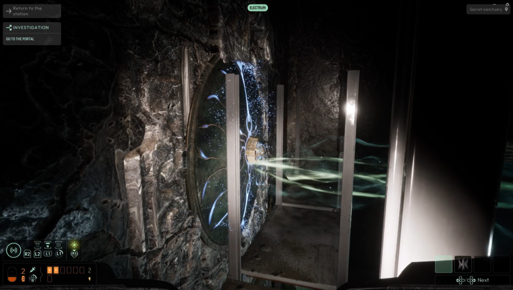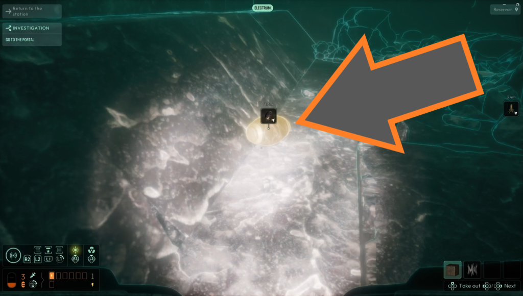 You’ll be in a partially submerged chamber with a large machine in its centre, under the water. Analyse it to unlock the Electrum frequency. Equip this new frequency and use it to find the piece of the machine that has fallen off. Pick it up and put it back in the machine to get it working again.