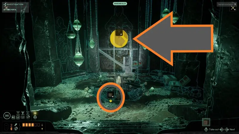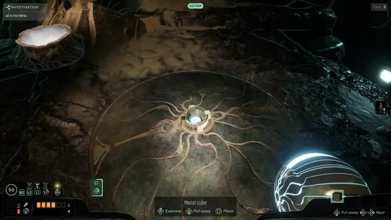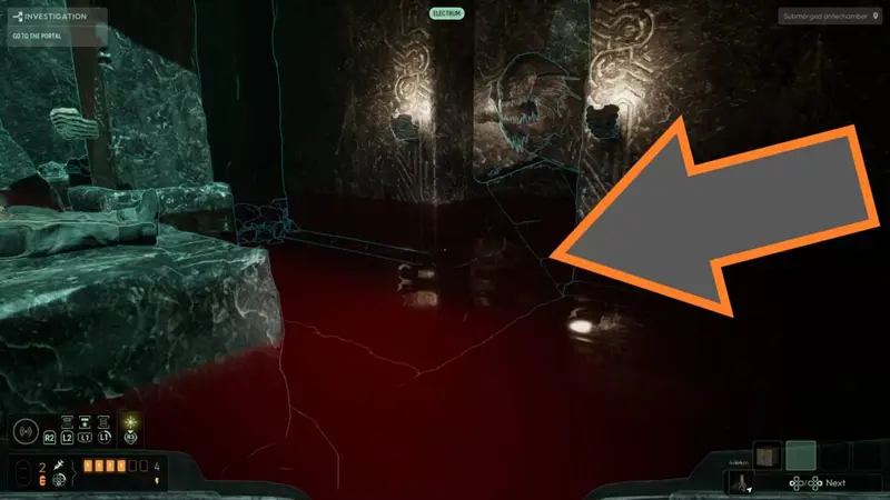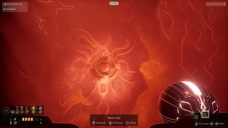 Eventually, you’ll reach a chamber with a skeleton sitting on a throne in the middle. Switch to the Unknown Alloy to locate a second cube in the water beneath another metal plate on the back wall of the room.