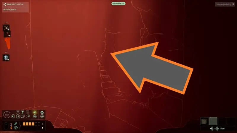 To the right of the sacrificial altar is an underwater passage you need to swim through (use your sonar to improve visibility). Equip the Unknown Alloy frequency to locate the next metal plate/cube combo, and head towards them into another long chamber.
