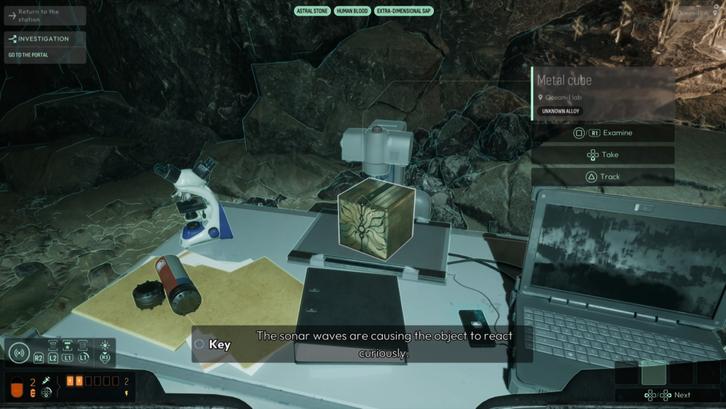 Head back up, and go through to the other half of Camp Mu you haven’t seen yet, and pick up the strange cube on the table.