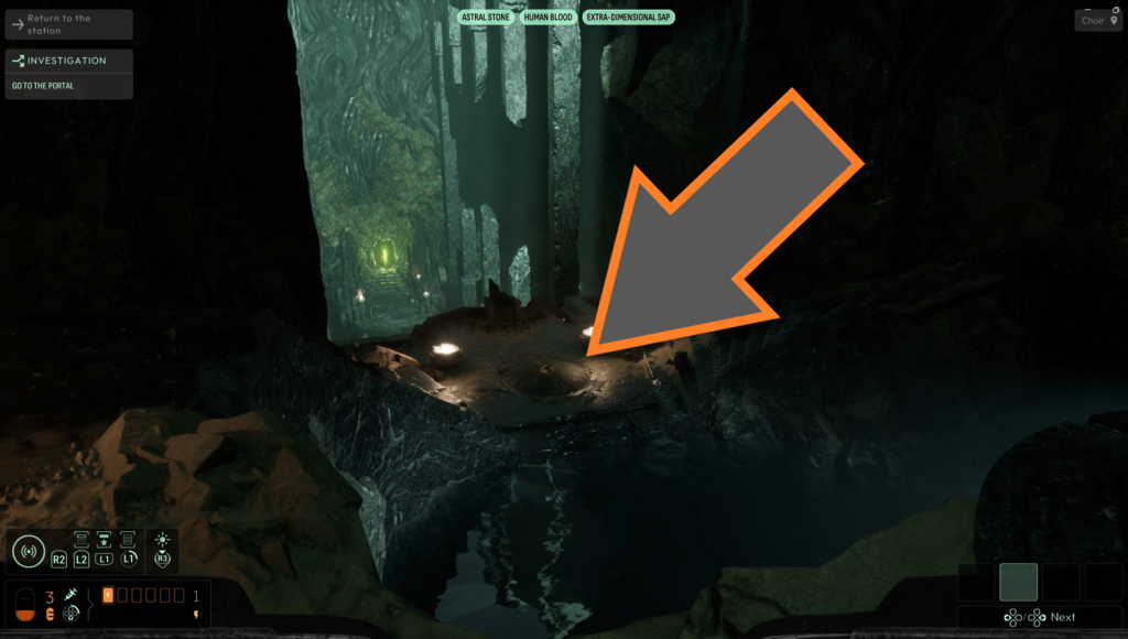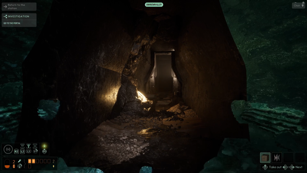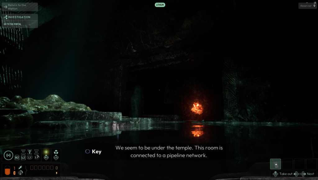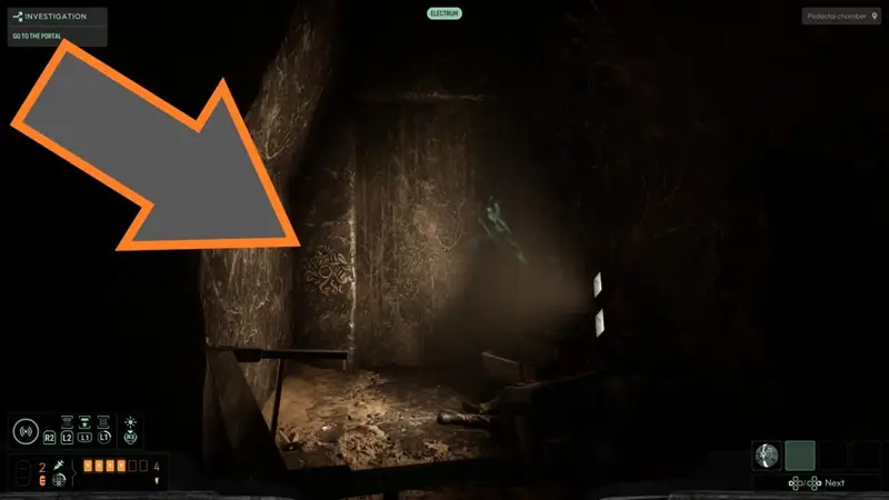Swim up and climb onto dry land to see another of those metal plates emitting strange signals. Follow the only way out back up to where David Curwen is in the central chamber, and go to the right of him through the door before the staircase to reach the Antechamber.