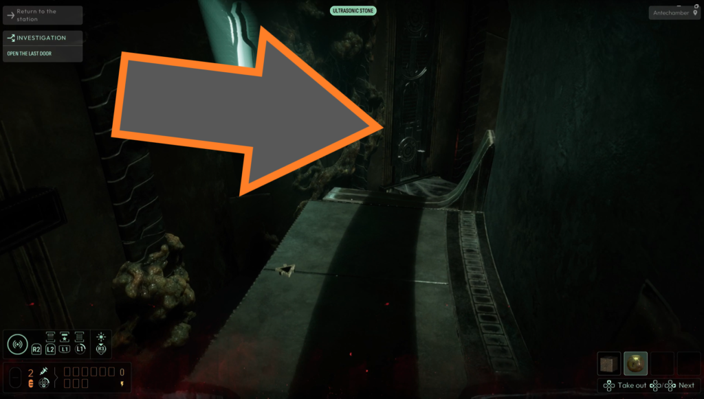 Equip the Ultrasonic Frequency and go down the staircase to the left of where you entered this large chamber to find a bridge at the bottom leading to a locked door. Analysing the door reveals details of a Song used to open the door.