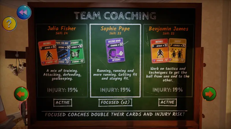 You’ll be visiting this area to plan out your Coaching strategies (which will determine your cards for the actual matches), as well as building the Skills of your stars. You can also use this area to assess team injuries and recovery time frames.