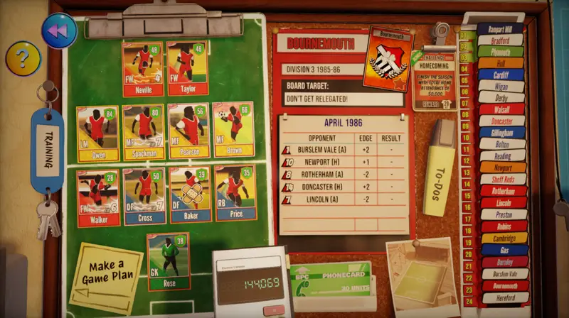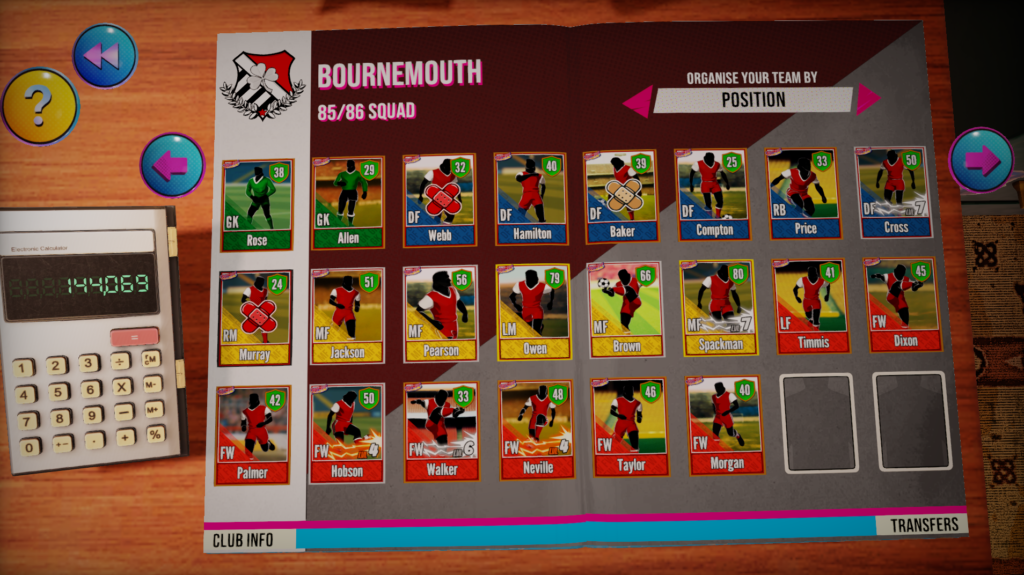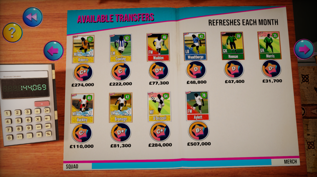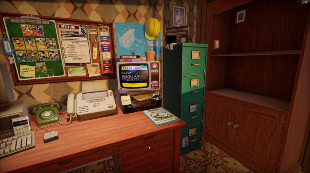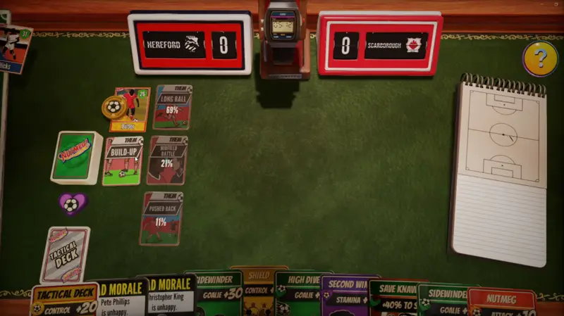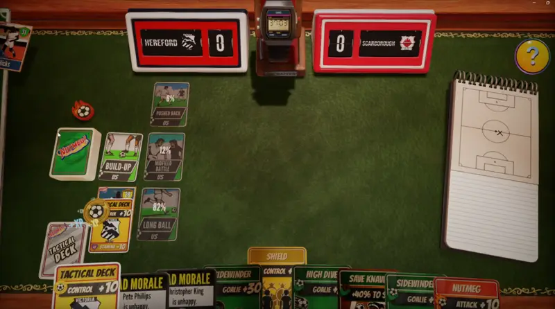 As the name implies, Nutmeg! A Nostalgic Deckbuilding Football Manager is set in the 1980’s and 1990’s, amongst the football divisions of England. Now, while I am a complete novice when it comes to the world of English football, I am well acquainted with club names like Chelsea, Hartlepool, and Tottenham. Shoutout to my buddy from college who is a die-hard Spurs fan. You start as the humble manager of the small club in Hereford, set-up in a tiny, and era-appropriate, office.