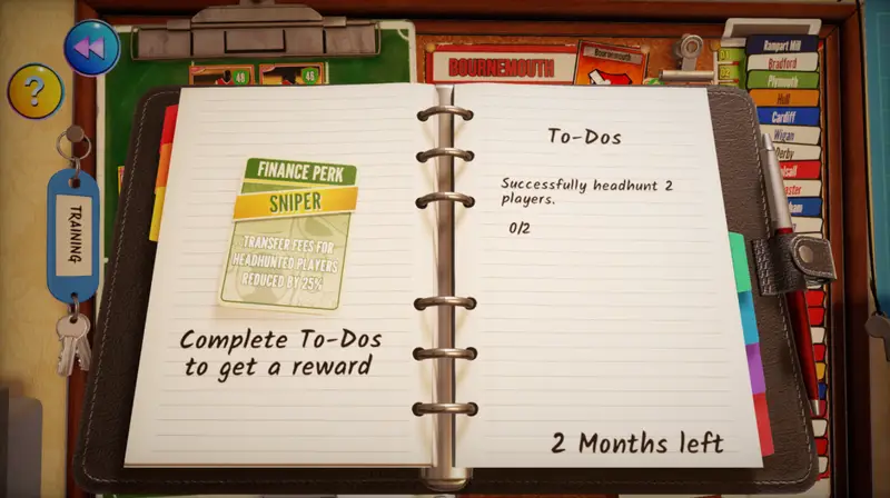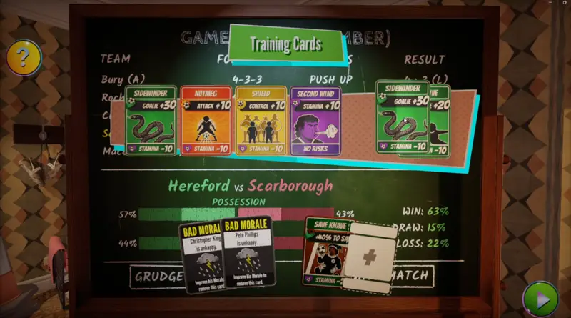 So – I guess there really isn’t much in terms of story when it comes to Nutmeg! A Nostalgic Deckbuilding Football Manager. You manage your football club and all the various tasks that are associated with it, and with each season, you can either stay with your current club, or look for greener pastures with another club. Interestingly enough, not all clubs are available from the get-go. You need to collect Kit Points, which are earned at the end of each season. Kit Points allow you to unlock access to new clubs. After two seasons, I left the lovely chaps at Hereford and sought the greener pastures of Bournemouth.