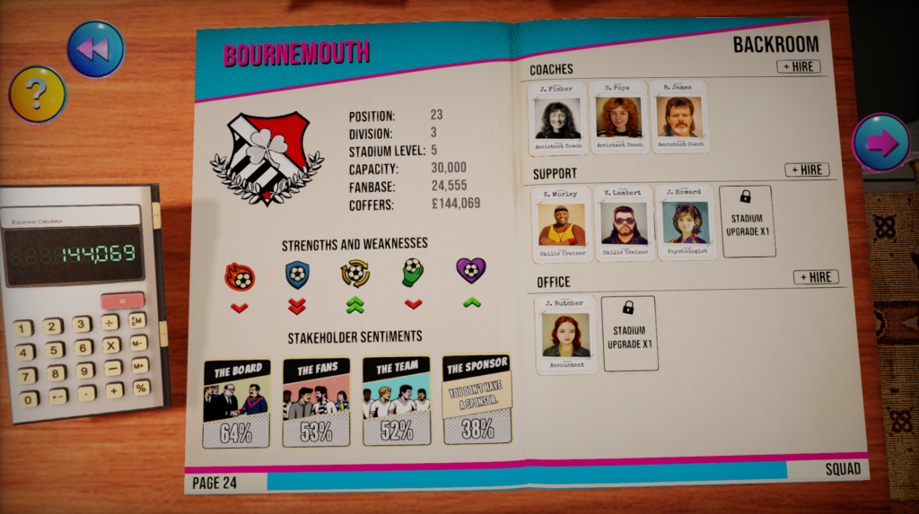 - Bank Manager – Tells you about your finances when it comes to club management.