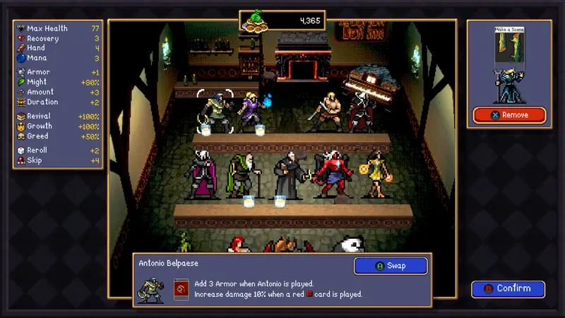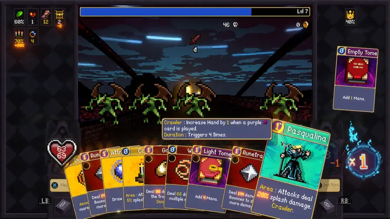 New to the series is the gem system. Gems are upgrades you can get in the dungeon during level ups, that will grant you new bonuses and upgrades to your cards. Most of the cards will have one gem slot, which can be upgraded later to allow you to have two gem slots. These gems can range from doubling your damage, duplicating your card, decreasing the mana needed, or turning the card into a wildcard. The gem system is a great addition and I’d love to see a version of it potentially being introduced into Vampire Survivors.