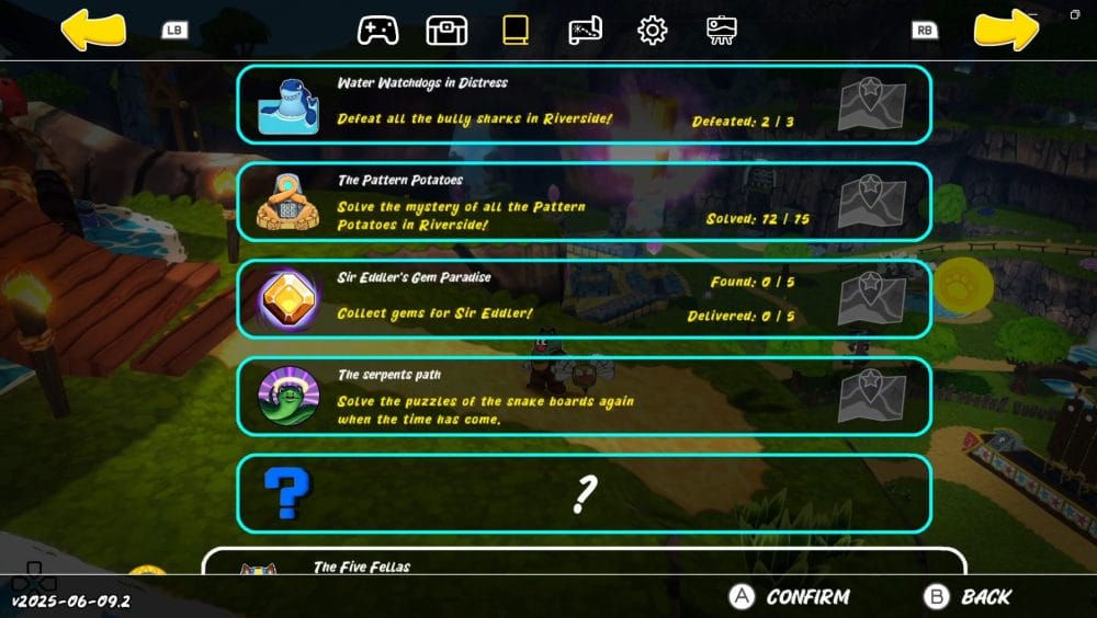 As for side content, well, it is hard to miss, as it is everywhere! There are several side quests in Ruffy and the Riverside, which are all tracked in the game’s pause menu. Again, I found the variety of what you need to do to help the inhabitants of Riverside quite surprising, and they could all be undertaken at the same time, with no time restraints. Between kicking Bully Sharks out of fish ponds, matching mushrooms, jumping into 2D wall puzzles, cleaning up waterways, and racing on hay bales (you can use hay bales to get around quicker and grind on rails as well), I was never at a loss for things to do.