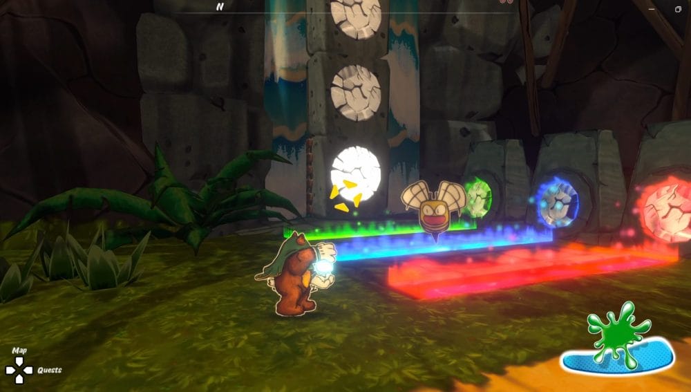 If there were one word to describe the world and vibe of Ruffy and the Riverside, it is “wacky”, so it feels right at home within the family of 3D platformers. You play as Ruffy, an upbeat bear in a cape with a bounce in his step, who is accompanied everywhere by his cheeky bee buddy, Pip. A new dynamic duo to add to the roster! Ruffy lives an easygoing life, helping his foster parent in their painting shop, and that’s because Ruffy has a special power: the Swap. Ruffy can swap a great many things across the world of Riverside, from numbers and symbols to full environmental textures! It is the Swap that is the crux of the game’s story, and it is this unique mechanic that sets Ruffy and the Riverside apart, opening up its gameplay in some truly mind-blowing ways.